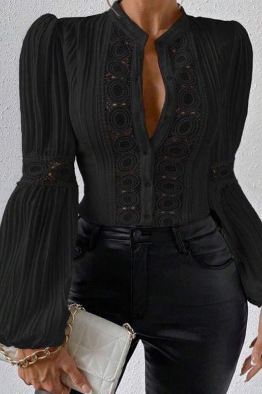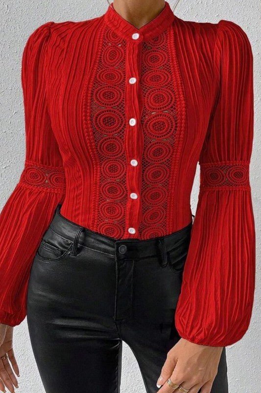 This elegant blouse showcases a stunning front lace pattern and mid-length sleeves, accented with a gorgeous, embroidered design. The long sleeves add a touch of sophistication to this piece.