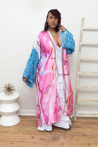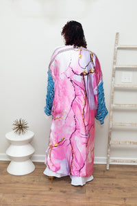 Soft meets statement in this must-have layering piece. Designed with bold prints and standout textured denim sleeves, this kimono brings the perfect balance of elegance and edge.