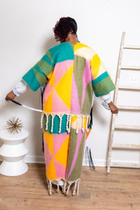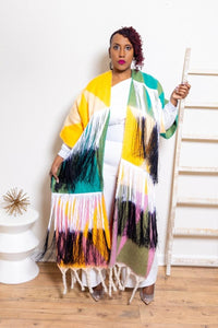 The I'm The Fly Auntie Fringe Kimono is designed for the woman who walks in confidence and lets her style do the talking. Featuring bold color blocking, dramatic fringe detailing, and a long, flowy silhouette, this kimono instantly elevates any look from simple to show-stopping.