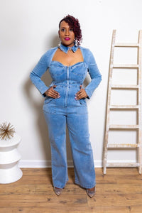 The Denim Icon Jumpsuit features a structured corset-style bodice with a zip-front closure and subtle cutout neckline that highlights your curves in all the right places. Designed with long sleeves and a wide-leg silhouette, this denim jumpsuit balances sexy and sophisticated effortlessly.
