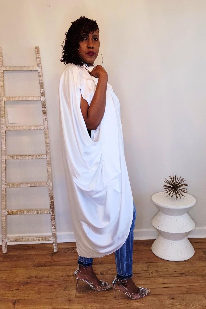 This is not your basic white dress/top. The Grown Grace Dress features a dramatic draped silhouette with a high neckline with a bow, and fluid movement that commands attention without saying a word. Lightweight and airy, it delivers effortless elegance whether styled casually with denim or elevated for a polished, grown look.